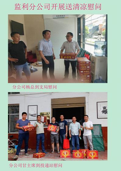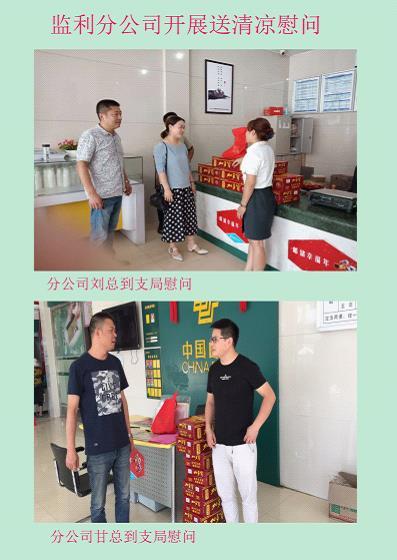 監(jiān)利縣分公司領(lǐng)導(dǎo)班子3人均是“80后”,年輕的領(lǐng)導(dǎo)班子始終堅持以人為本,心系一線職工。進入三伏天后,天氣持續(xù)高溫,三位年輕的領(lǐng)導(dǎo)冒著酷暑分頭到各支局、投遞站、包裹快遞部、郵件處理班為生產(chǎn)一線的員工送去了暑藥和涼茶。總經(jīng)理楊欽華說“員工幸福我幸福,我為員工送清涼”。他要求支局經(jīng)理做好高溫天氣職工的防暑降溫工作,注意生產(chǎn)安全和人身安全,希望投遞員師傅早點出班,防止中暑。并鼓勵支局員工不畏高溫,搶抓當(dāng)前業(yè)務(wù)發(fā)展政策和保險產(chǎn)品,確保全年保險計劃的達(dá)成。(湖北省郵政工會)