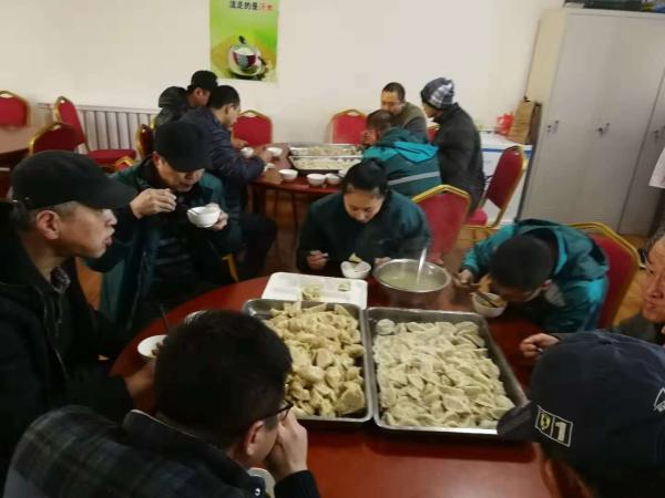 在熱熱鬧鬧的食堂里,大家都各顯伸手,有揉面的、有搟皮的、有負責包的,忙得不易樂乎。人多力量大,一個多小時的時間2000多個餃子就包好了。為了能讓員工吃的可口,特意包了酸菜陷和芹菜陷的蒸餃和水餃。剛包完餃子,轉(zhuǎn)運車進來了,孫立春總經(jīng)理領(lǐng)導班子成員一行又去了工作場地。