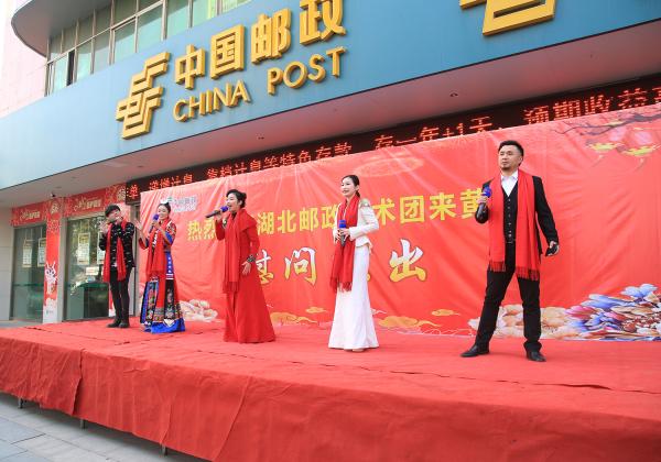 省郵政藝術(shù)團(tuán)送溫暖慰問(wèn)小分隊(duì)為現(xiàn)場(chǎng)職工和郵政客戶帶來(lái)精彩的慰問(wèn)演出,獻(xiàn)唱了《黃梅飄香》、《這里是湖北》等經(jīng)典曲目,并邀請(qǐng)現(xiàn)場(chǎng)觀眾共同演唱戲曲《夫妻雙雙把家還》。演出現(xiàn)場(chǎng)和諧喜慶,氣氛活躍。省分公司和基層一線員工的心因傳統(tǒng)文化的魅力緊緊連在一起,也彰顯了湖北郵政的強(qiáng)大正能量?;顒?dòng)現(xiàn)場(chǎng)還穿插了郵政業(yè)務(wù)知識(shí)有獎(jiǎng)答題環(huán)節(jié)。現(xiàn)場(chǎng)觀眾手持宣傳折頁(yè)踴躍上臺(tái)搶答,將演出現(xiàn)場(chǎng)氣氛不斷推向高潮。