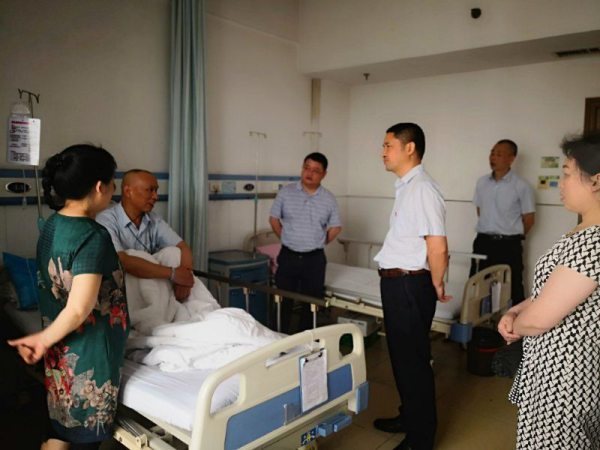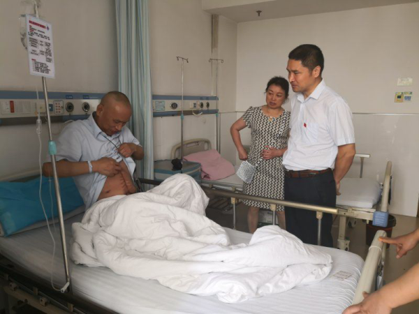 近日,益陽市分行工會(huì)主席夏劍、副主席劉志軍、桃江縣工會(huì)主席周馥一行來到桃江縣人民醫(yī)院慰問桃江縣支行重病職工許衛(wèi)民。在病房中,夏主席親切的與許衛(wèi)民同志交談,詢問他的病情、治療情況及目前的家庭生活情況,并鼓勵(lì)他一定要積極樂觀,積極配合治療,爭取早日康復(fù)。隨后,向其送上了慰問品及3萬元慰問金。