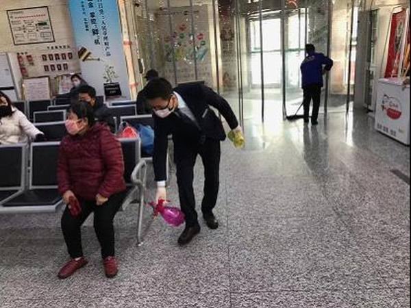 圖為胡吉?jiǎng)偡艞壭菹r(shí)間,義務(wù)幫助支局網(wǎng)點(diǎn)開展服務(wù)引導(dǎo)與消殺工作