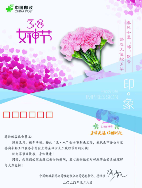 為為體現(xiàn)對郵政女工及家庭的關(guān)心關(guān)懷,表達對女職工的感激感謝,幫助他們抵御家庭風(fēng)險,鼓勵他們以更加飽滿的精神狀態(tài)投身郵政事業(yè)發(fā)展,構(gòu)建和諧的企業(yè)氛圍,淮南市分公司在2020“三八"來臨之際,細致入微的為每位“綠衣女神”精心準備了多種“神秘大禮”,一是為每位女職工及家庭投保了家庭財產(chǎn)和個人意外保險,全力解決員工及家庭“后顧之憂”;二是為每位“女神”購買了75%酒精消毒洗手液,堅決保障疫情期間員工安全健康:三是給每位女神家庭送去有機大米,保障女職工員工家庭生活;四是為“女神”送上傳遞市分公司關(guān)懷的“濃情賀卡”,感謝女職工及家人對郵政事業(yè)的真誠理解與大力支持,鼓舞他們繼續(xù)為郵政發(fā)展注入力量。