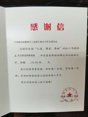 愛心款項(xiàng)已于近日通過杭州市紅十字會(huì)全額定向捐助給浙江大學(xué)醫(yī)學(xué)院附屬第一醫(yī)院,并簽訂定向捐助浙江大學(xué)醫(yī)學(xué)院附屬第一醫(yī)院防疫工作的專項(xiàng)合同。省分行機(jī)關(guān)工會(huì)同時(shí)收到了浙一醫(yī)院辦公室的感謝致電以及杭州紅十字會(huì)對(duì)郵儲(chǔ)銀行的防疫工作公益愛心感謝信。