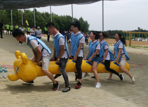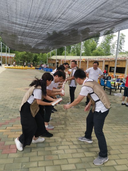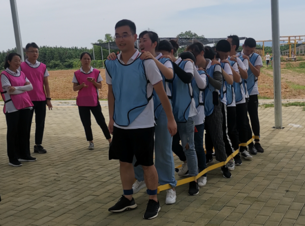 當天早上9點,大家統(tǒng)一乘車前往羅坊錦園拓展基地。到達基地后,在教官的指揮下,大家踩著歡快的節(jié)拍開始了活動前的熱身舞。各個新建團隊按照教官的指令開始了團隊展示活動。展示結(jié)束,各隊成員團結(jié)一致,通力合作,共同完成了“毛毛蟲”、“同舟共濟”、“十人九足”、“千里傳珠”等團建項目。