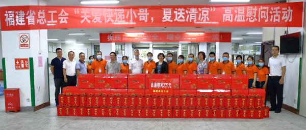 時下已進(jìn)入一年中最熱的三伏天。 7月17日下午,省總工會副主席張彩珍、基層工作部部長鄧銀行、福州市總工會副主席王慷等一行在省郵政分公司副總經(jīng)理、工會主席王全江,副主席張勇的陪同下來到福州市郵政分公司斗門投遞營業(yè)部,向奮戰(zhàn)在高溫一線的快遞小哥送去了防暑降溫物品,傳遞了省、市總工會對快遞小哥的親切慰問和關(guān)懷。
