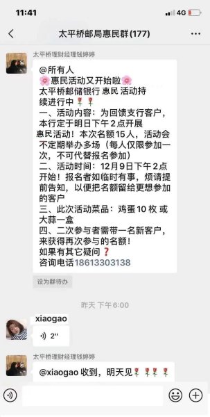據(jù)了解,參與“便民服務(wù)商圈”金融客戶惠民體驗(yàn)活動(dòng)(以下簡稱活動(dòng))的百姓,能以低于市場(chǎng)均價(jià)的方式購買到“郵商聯(lián)盟”商戶(支行長期合作果蔬商)提供的時(shí)令果蔬,果蔬種類逢周更新,涉及西紅柿、香菇、油菜、大蒜、老玉米、扁豆等二十多種常見生活必需品。 活動(dòng)前夕,客戶可通過支行客戶微信群發(fā)起的活動(dòng)邀約信息,集中進(jìn)行線上接龍式報(bào)名;“接龍報(bào)名”一方面便于支行工作人員高效采集活動(dòng)參與人員信息,另一方面也是提高群成員互動(dòng)、營造良好群營銷氛圍的好方法?;顒?dòng)規(guī)定每名金融客戶常規(guī)僅可參與一次優(yōu)惠,若老客戶邀請(qǐng)新客戶入群,可二次參加優(yōu)惠活動(dòng)。在活動(dòng)現(xiàn)場(chǎng),支行理財(cái)經(jīng)理穿插為客戶講解了資產(chǎn)配置、新版人民幣真?zhèn)舞b別技巧等內(nèi)容,并宣講了2021年代理金融“開門紅”即將推出的金融產(chǎn)品。