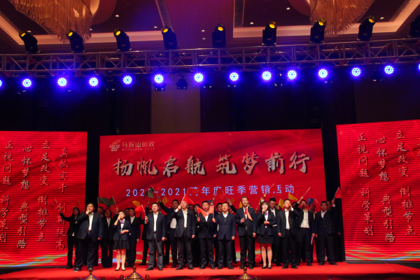 表彰晚會在市分公司工會編排的《戰(zhàn)鼓》中拉開本次大會的序幕,鼓樂聲聲響徹全場;和縣分會歌伴舞《超越夢想 郵政遠航》詮釋了廣大員工跨賽以來所做出的不凡業(yè)績;機關工會配樂詩朗誦《致敬,我們心中的最美》從不同角度謳歌馬鞍山郵政人敢與拼搏的企業(yè)精神。之后萬頃總經理首先從“不經冬寒不知春暖”肯定了2020-2021旺季金融營銷活動取得的來之不易的成果,奮斗汗水澆灌夢想之花;然后萬總從市場占有率、旺季點均余額及資產分析我們與同業(yè)機構、與先進單位之間的差距,指出馬鞍山郵政金融未來可期;提出征途漫漫,唯有不懈奮斗,始終以“干在實處 走在前列 科學發(fā)展”為工作指引,為早日實現(xiàn)馬鞍山市分公司余額規(guī)模200億目標,全體馬鞍山郵政人應保持夢想在心,更須”快馬“加鞭!最后表彰大會在全場齊唱《明天會更好》中結束,以寓意著馬鞍山郵政員工們心系一條心,勁往一處使,以飽滿的熱情、堅定的信心迎接美好的明天。