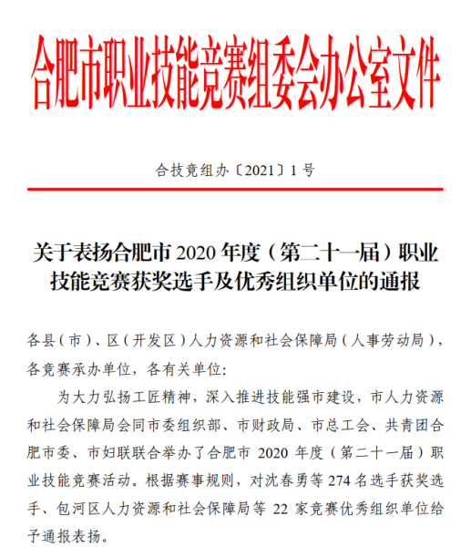 近日,從合肥市職業(yè)技能競賽組委會(huì)辦公室獲悉,合肥郵區(qū)中心局蟬聯(lián)合肥市 2020年度(第二十一屆)職業(yè)技能競賽優(yōu)秀組織單位。孔志銘等6名同志榮獲“合肥市技術(shù)能手”榮譽(yù)稱號(hào)。該局連續(xù)十二年承辦合肥市業(yè)務(wù)技能競賽,連續(xù)十二年被評(píng)為優(yōu)秀組織單位,涌現(xiàn)一批集團(tuán)、省級(jí)業(yè)務(wù)技術(shù)能手及上百名市級(jí)術(shù)能手和金牌職工。
