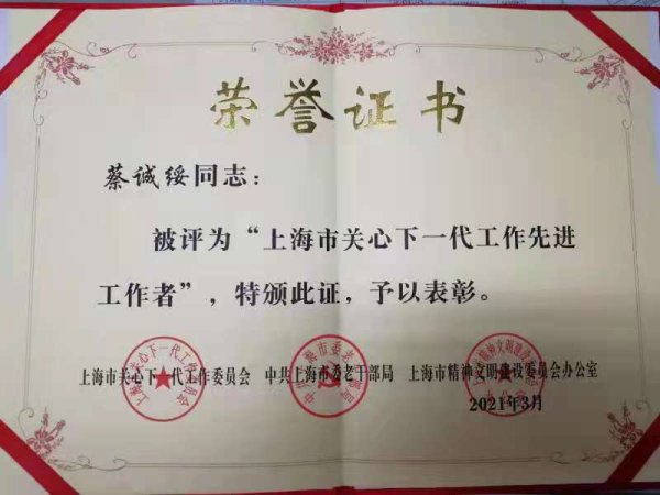 蔡誠(chéng)綏同志退休后,并沒(méi)有在家頤養(yǎng)天年,而是充分發(fā)揮作用參與志愿服務(wù)。作為虹口區(qū)嘉興路街道關(guān)心下一代工作委員會(huì)的成員,他積極投身于關(guān)心下一代的工作中,懷著一顆熾熱奉獻(xiàn)的愛(ài)心,十幾年來(lái)踐行無(wú)私奉獻(xiàn)的志愿精神,滿腔熱情地為下一代健康成長(zhǎng)發(fā)揮余熱,燃燒自己的光和熱,溫暖下一代,給社會(huì)注入源源不斷的正能量。多次被評(píng)為“全國(guó)關(guān)心下一代工作先進(jìn)個(gè)人”“上海市優(yōu)秀黨員”“上海市慈善之星”“上海市優(yōu)秀志愿者”。