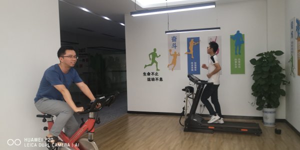 圖為生產經營部門的員工利用工作之余,在生產場地開辟出來的小健身室里進行跑步和騎動感單車。(江西省郵政工會)