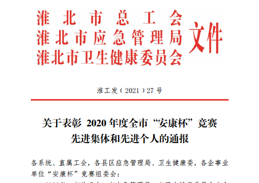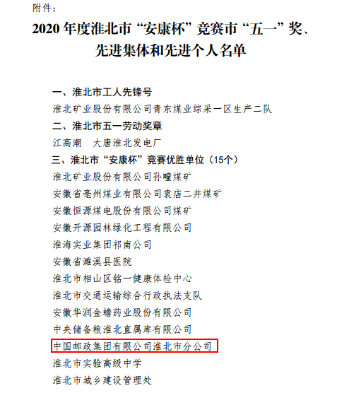 近日,淮北市總工會(huì)、淮北市應(yīng)急管理局、淮北市衛(wèi)生健康委共同下文表彰全市“安康杯”競(jìng)賽先進(jìn)集體和先進(jìn)個(gè)人,淮北郵政榮獲2020年度淮北市“安康杯”競(jìng)賽優(yōu)勝單位稱號(hào)。