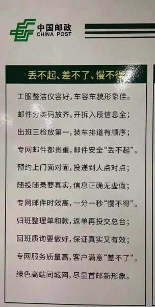 丟不起:行政辦公重要文件、發(fā)票尤為重要; 差不了:運營質(zhì)量直接影響客戶用郵體驗; 慢不得:農(nóng)產(chǎn)品進(jìn)京,生鮮配送,時效性強(qiáng); "丟不起,差不了,慢不得"形成同城業(yè)務(wù)分公司特色的企業(yè)文化,同城人,努力踐行這一口號,在政務(wù)類專遞,生鮮配送,中醫(yī)藥寄遞等高端快遞服務(wù)領(lǐng)域,努力提升各項運營指標(biāo)。堅持“新、高、特”項目的拓展,突出保障收入單價高、內(nèi)件附加值高、運營KPI指標(biāo)高、指定手續(xù)投交或需使用客戶專屬設(shè)備和系統(tǒng)(APP)的高端、個性化、優(yōu)質(zhì)項目,不只局限于簡單投遞支撐。(北京郵政工會)