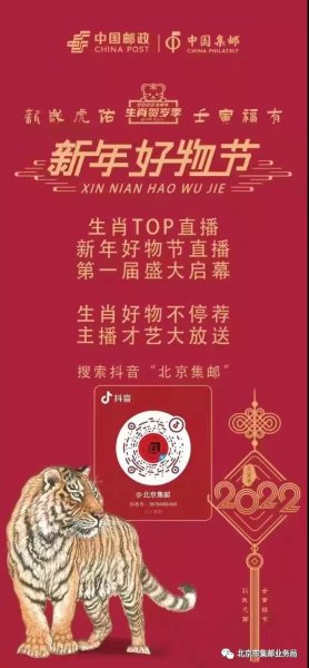 生肖文化連接著傳統(tǒng)民族文化與當代品質(zhì)生活,為了讓更多人享受到中國郵政生肖文化盛宴,在此歲末年初生肖更替之際,中國郵政開啟2021首屆“中國郵政·文化季” 暨《壬寅年》中國集郵生肖賀歲季。北京郵政在此次生肖賀歲季中主推線上、線下“新年好物節(jié)”活動,線上通過“北京集郵”抖音號等公眾平臺,進行連續(xù)直播推薦好物;線下在全市多個郵政支局、支行、主題郵局和生肖原地郵局開展“新年好物節(jié)”主題回饋活動。