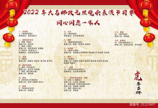 12月28日晚,邯鄲大名郵政分公司舉辦了2022年迎新年元旦晚會(huì),晚會(huì)節(jié)目形式多樣、內(nèi)容豐富,有歌曲、戲曲、舞蹈、小品、相聲、詩朗誦、三句半等,全部由職工自編自演,職工和職工家屬共約400人觀看了晚會(huì)。此次晚會(huì)充分展現(xiàn)了一年來企業(yè)經(jīng)營(yíng)發(fā)展的豐碩成果和職工蓬勃向上的精神面貌,營(yíng)造了團(tuán)結(jié)一心、和諧融洽的企業(yè)文化氛圍。(河北省郵政工會(huì))