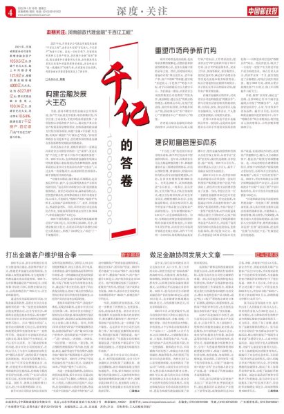 1月19日,《中國(guó)郵政報(bào)》以《千億的答卷》為題,對(duì)河南省分公司金融業(yè)務(wù)勞動(dòng)競(jìng)賽發(fā)展取得的優(yōu)異成績(jī)進(jìn)行了整版報(bào)道。