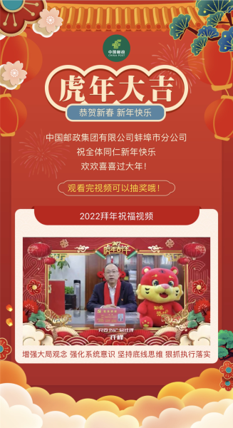 新春佳節(jié)來(lái)臨之際,為營(yíng)造喜慶祥和的新年氛圍,1月30日,蚌埠市郵政分公司開展2022年新春祝福團(tuán)拜活動(dòng),工會(huì)會(huì)員以掃碼方式觀看,在新春祝福團(tuán)拜視頻中,市分公司全體黨組成員線上為廣大職工送上新春祝福,同時(shí),穿插了五輪抽獎(jiǎng),驚喜“郵”禮幸運(yùn)派送,給廣大職工送上虎年大禮。