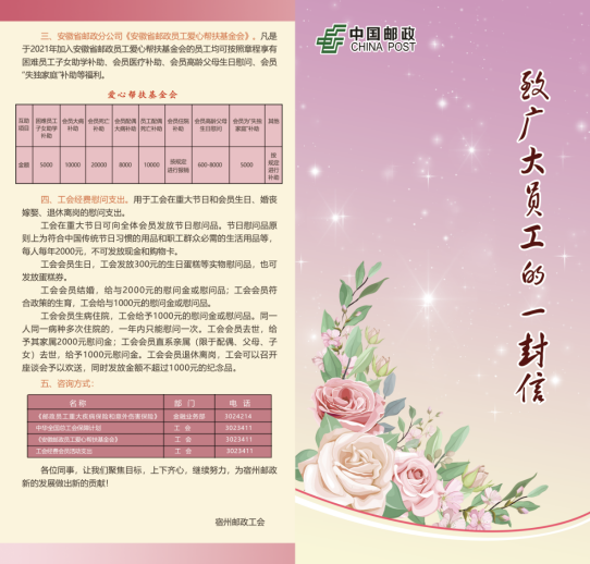 內(nèi)容包含五個(gè)方面:一是中郵保險(xiǎn)《郵政職工重大疾病保險(xiǎn)和意外傷害保險(xiǎn)》;二是中華全國(guó)總工會(huì)《在職職工意外傷害互助保障計(jì)劃》《在職職工重大疾病互助保障計(jì)劃》《在職女職工特種疾病互助保障計(jì)劃》;三是安徽省郵政分公司《安徽省郵攻職工愛(ài)心幫扶基金會(huì)》;四是工會(huì)經(jīng)費(fèi)慰問(wèn)支出;五是咨詢方式。