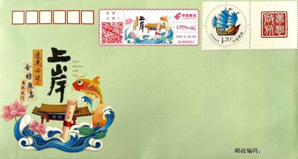 據(jù)悉,此次啟用的“上岸”郵資機宣傳戳和紀念封由青年設(shè)計師毛利設(shè)計,圖案設(shè)計風格采用了中國傳統(tǒng)與現(xiàn)代相結(jié)合的方式,選用了“鯉魚跳龍門”這一傳統(tǒng)素材,配以上岸元素、喜報及時下網(wǎng)絡用語,給郵資機戳賦予了新的內(nèi)涵。紀念封貼“夢想遠航”個性化郵票原票,為所有莘莘學子保駕護航,為正在愛情征途上的情侶祈愿連理,為各種努力的人們馬到功成。該枚郵資機宣傳戳使用期限為一年。(北京郵政工會)