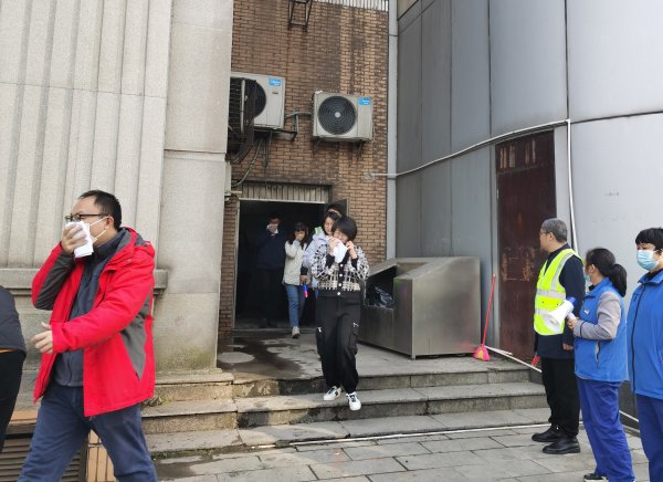 “請大家不要驚慌,聽從指揮。15樓配電間發(fā)生火情……”當(dāng)天下午3點,金源大廈各樓層突然煙霧彌漫,引發(fā)火災(zāi)警報器不停地閃爍鳴叫,消防逃生疏散實戰(zhàn)演習(xí)正式拉開序幕。各部門消防責(zé)任人、義務(wù)消防員第一時間組織本部門員工有序疏散。大家聽從指揮,統(tǒng)一拿濕毛巾捂住口鼻,低頭彎腰,從大樓兩側(cè)消防通道安全迅速撤離至一樓院內(nèi)。