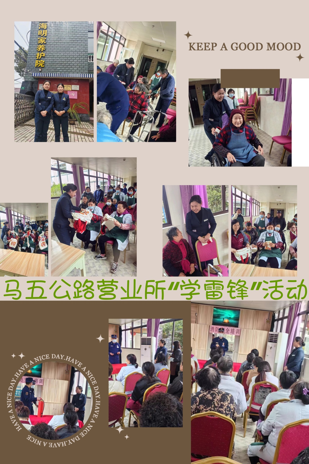 百善孝為先,為進(jìn)一步弘揚(yáng)敬老、愛(ài)老的傳統(tǒng)美德,營(yíng)造關(guān)愛(ài)老人的良好氛圍,在“3?5學(xué)雷鋒日”來(lái)臨之際,泥城支局彭鎮(zhèn)郵政所組織青年骨干走進(jìn)明家養(yǎng)老院開(kāi)展志愿服務(wù)。此次活動(dòng)會(huì)同消防員講解滅火器的使用以及遇到火災(zāi)應(yīng)如何冷靜處理。安全講解結(jié)束后,消防隊(duì)員們現(xiàn)場(chǎng)為老人理發(fā);郵政青年與老人話家常、主動(dòng)推輪椅帶老人散心,讓老人們切實(shí)感受到郵政網(wǎng)點(diǎn)的關(guān)愛(ài)和溫情。