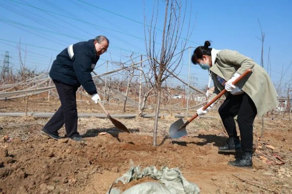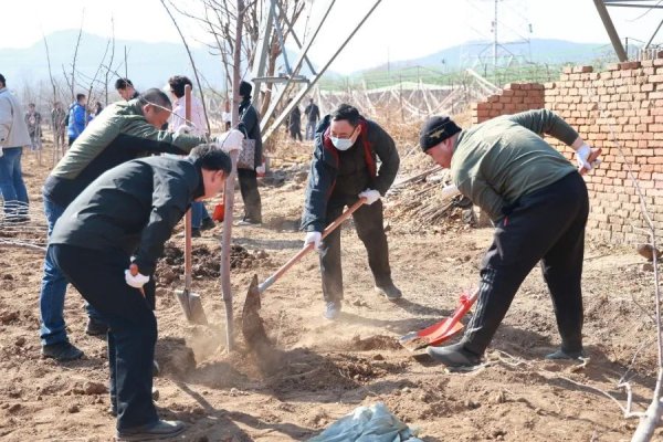 揮鍬鏟土、扶樹培土、圍堰澆水…… 植樹現(xiàn)場,大家3人一組默契配合,共同完成搬運(yùn)、扶種、填土等環(huán)節(jié),保質(zhì)保量地完成了預(yù)期植樹目標(biāo)。經(jīng)過一番熱火朝天的勞動,一棵棵蘋果樹苗迎風(fēng)佇立,為大地增添綠意生機(jī)。